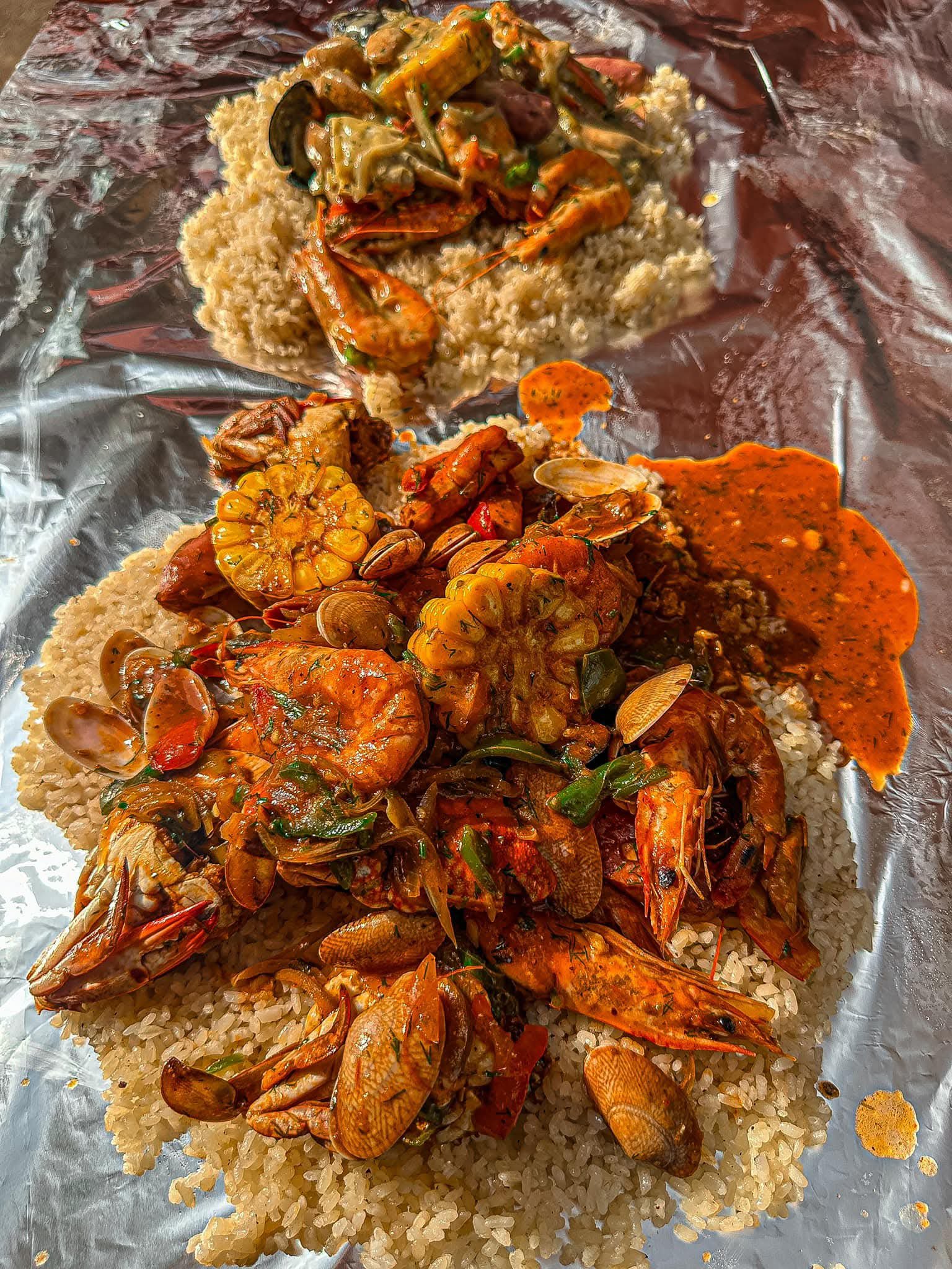 ميكس الجمبري و الكاليماري و بلح البحر و الكابوريا مع الذرة الحلوة و صوص شريمبو المميز